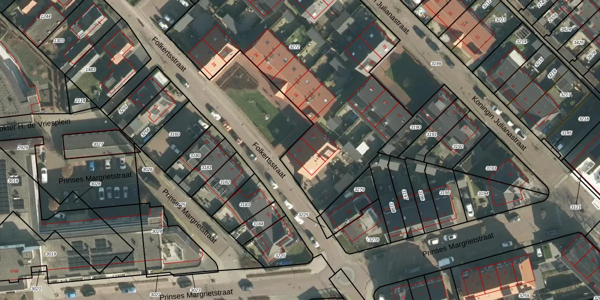 Het perceel waarop Folkertsstraat 12 staat heeft een oppervlakte van 3710 m². Dit is een zeer groot perceel. De perceeloppervlakte wordt geregistreerd door het Kadaster. Gedetailleerde informatie over de maten van dit perceel kunt u vinden in het rapport Kadastrale kaart met maatvoering van Folkertsstraat 12.