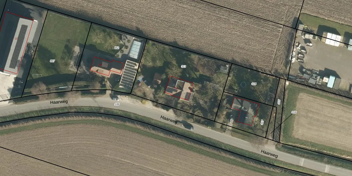 Het perceel waarop Haarweg 1-A staat heeft een oppervlakte van 1645 m². Dit is een zeer groot perceel. De perceeloppervlakte wordt geregistreerd door het Kadaster. Gedetailleerde informatie over de maten van dit perceel kunt u vinden in het rapport Kadastrale kaart met maatvoering van Haarweg 1-A.