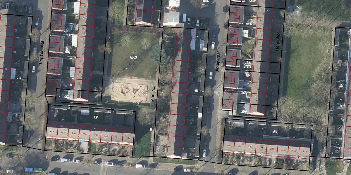 Het perceel waarop Abdijhof 19 staat heeft een oppervlakte van 1948 m². Dit is een zeer groot perceel. De perceeloppervlakte wordt geregistreerd door het Kadaster. Gedetailleerde informatie over de maten van dit perceel kunt u vinden in het rapport Kadastrale kaart met maatvoering van Abdijhof 19.