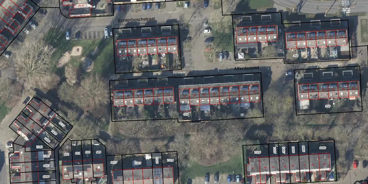 Het perceel waarop Afferdenpad 16 staat heeft een oppervlakte van 1939 m². Dit is een zeer groot perceel. De perceeloppervlakte wordt geregistreerd door het Kadaster. Gedetailleerde informatie over de maten van dit perceel kunt u vinden in het rapport Kadastrale kaart met maatvoering van Afferdenpad 16.