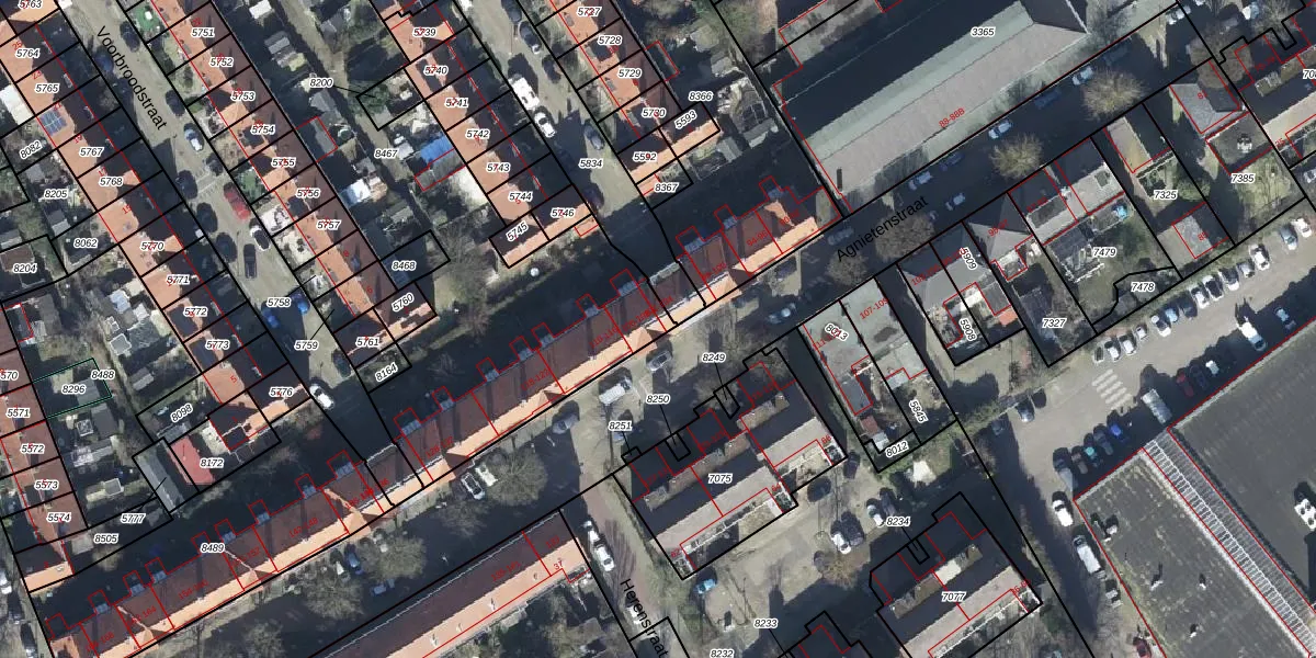 Het perceel waarop Agnietenstraat 108 staat heeft een oppervlakte van 2401 m². Dit is een zeer groot perceel. De perceeloppervlakte wordt geregistreerd door het Kadaster. Gedetailleerde informatie over de maten van dit perceel kunt u vinden in het rapport Kadastrale kaart met maatvoering van Agnietenstraat 108.