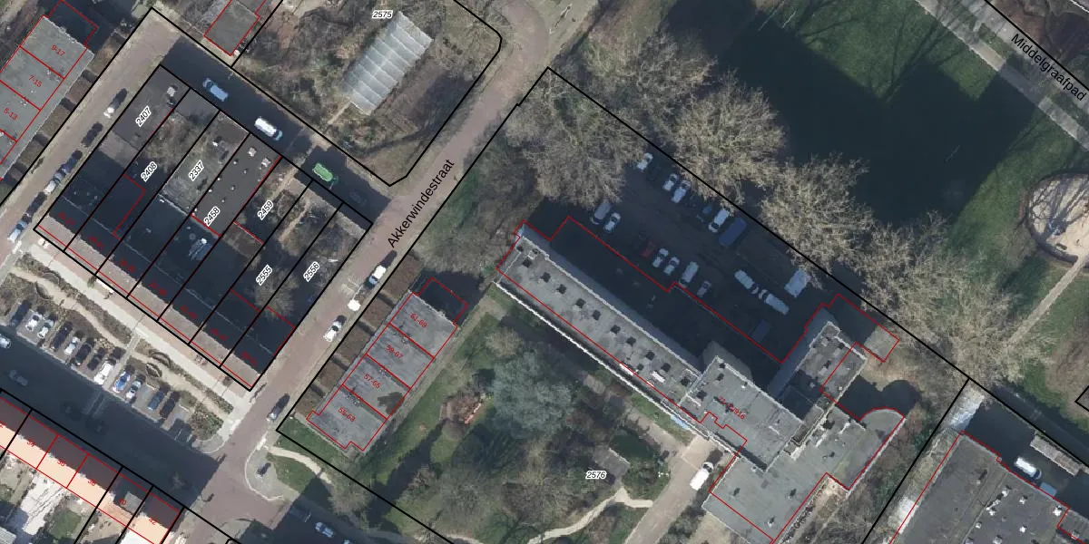 Het perceel waarop Akkerwindestraat 71-801 staat heeft een oppervlakte van 7960 m². Dit is een zeer groot perceel. De perceeloppervlakte wordt geregistreerd door het Kadaster. Gedetailleerde informatie over de maten van dit perceel kunt u vinden in het rapport Kadastrale kaart met maatvoering van Akkerwindestraat 71-801.