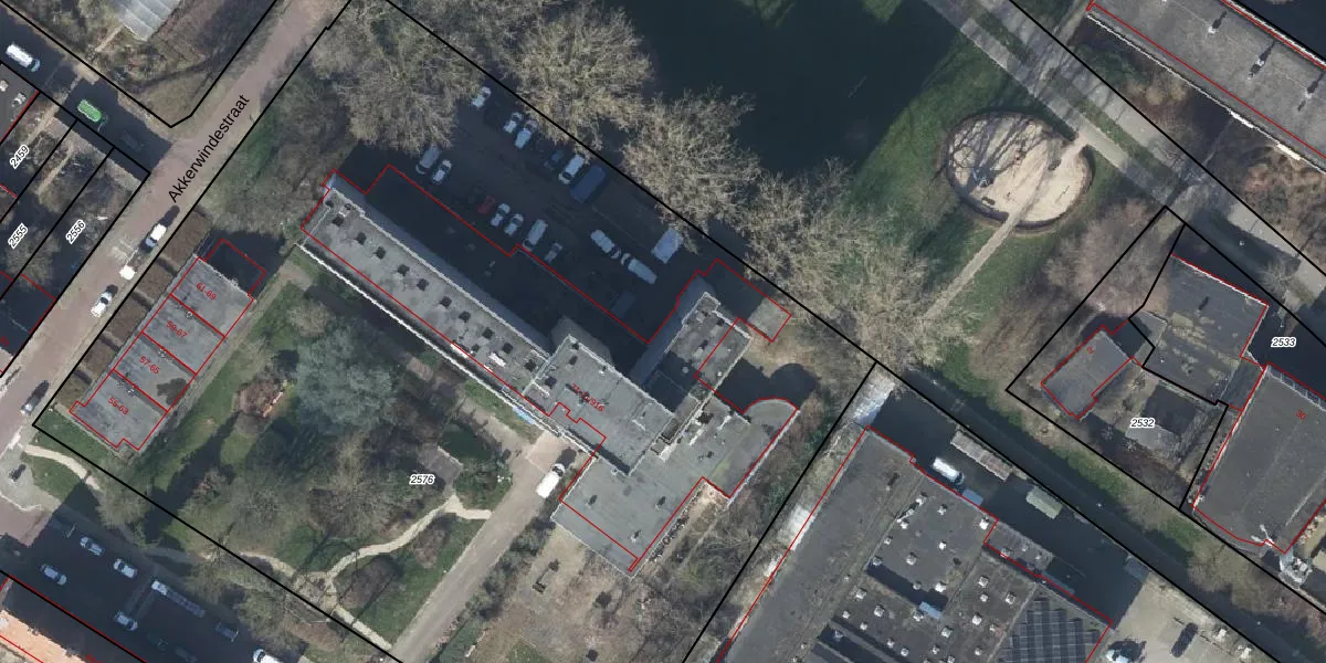 Het perceel waarop Akkerwindestraat 71-114 staat heeft een oppervlakte van 7960 m². Dit is een zeer groot perceel. De perceeloppervlakte wordt geregistreerd door het Kadaster. Gedetailleerde informatie over de maten van dit perceel kunt u vinden in het rapport Kadastrale kaart met maatvoering van Akkerwindestraat 71-114.