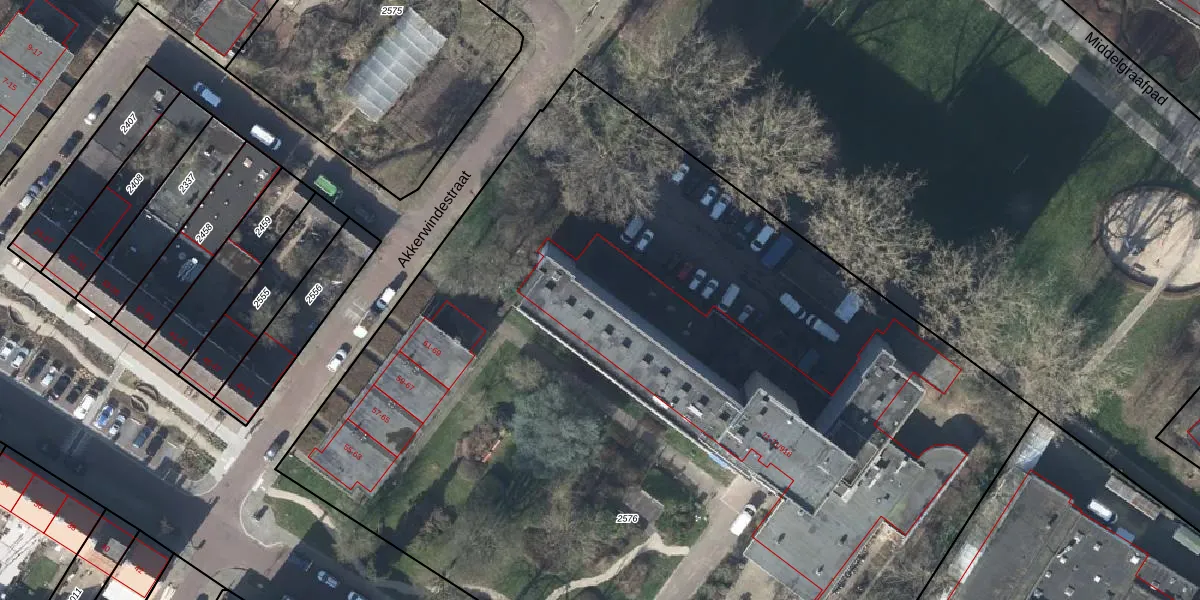 Het perceel waarop Akkerwindestraat 71-603 staat heeft een oppervlakte van 7960 m². Dit is een zeer groot perceel. De perceeloppervlakte wordt geregistreerd door het Kadaster. Gedetailleerde informatie over de maten van dit perceel kunt u vinden in het rapport Kadastrale kaart met maatvoering van Akkerwindestraat 71-603.
