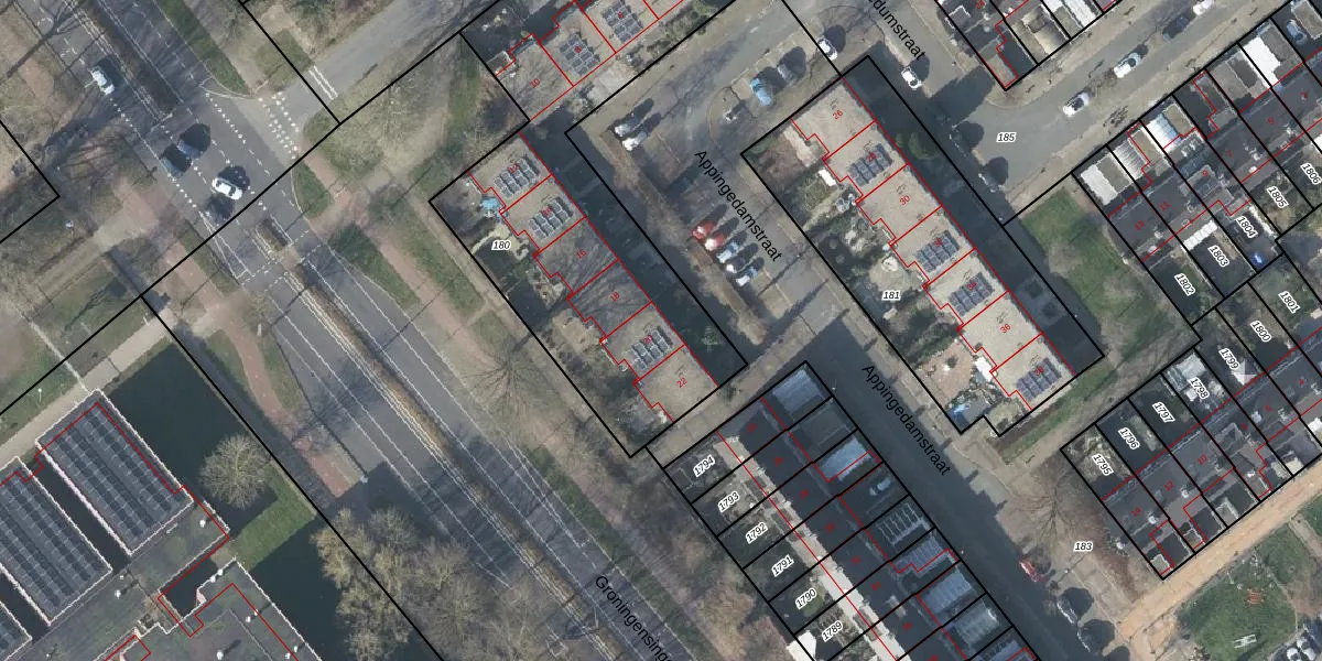 Het perceel waarop Appingedamstraat 20 staat heeft een oppervlakte van 2032 m². Dit is een zeer groot perceel. De perceeloppervlakte wordt geregistreerd door het Kadaster. Gedetailleerde informatie over de maten van dit perceel kunt u vinden in het rapport Kadastrale kaart met maatvoering van Appingedamstraat 20.