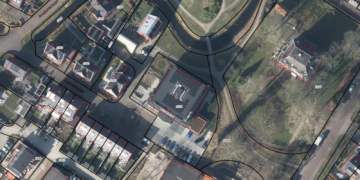 Het perceel waarop Aubadepad 36 staat heeft een oppervlakte van 1854 m². Dit is een zeer groot perceel. De perceeloppervlakte wordt geregistreerd door het Kadaster. Gedetailleerde informatie over de maten van dit perceel kunt u vinden in het rapport Kadastrale kaart met maatvoering van Aubadepad 36.