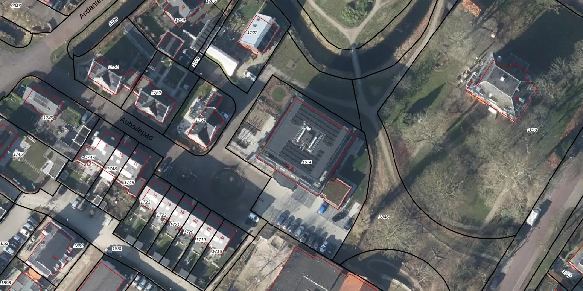 Het perceel waarop Aubadepad 48 staat heeft een oppervlakte van 1854 m². Dit is een zeer groot perceel. De perceeloppervlakte wordt geregistreerd door het Kadaster. Gedetailleerde informatie over de maten van dit perceel kunt u vinden in het rapport Kadastrale kaart met maatvoering van Aubadepad 48.