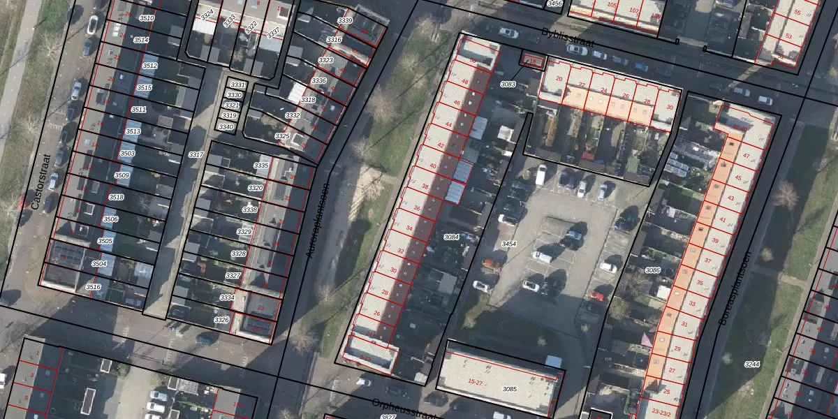 Het perceel waarop Auroraplantsoen 36 staat heeft een oppervlakte van 2634 m². Dit is een zeer groot perceel. De perceeloppervlakte wordt geregistreerd door het Kadaster. Gedetailleerde informatie over de maten van dit perceel kunt u vinden in het rapport Kadastrale kaart met maatvoering van Auroraplantsoen 36.