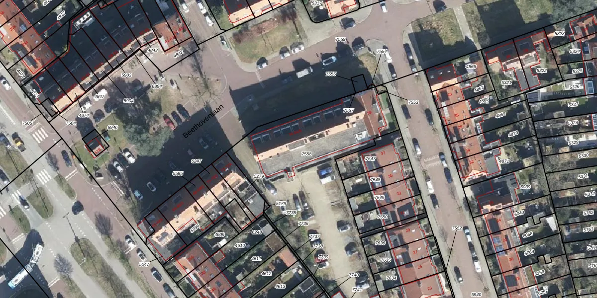 Het perceel waarop Beethovenlaan 84-2 staat heeft een oppervlakte van 2197 m². Dit is een zeer groot perceel. De perceeloppervlakte wordt geregistreerd door het Kadaster. Gedetailleerde informatie over de maten van dit perceel kunt u vinden in het rapport Kadastrale kaart met maatvoering van Beethovenlaan 84-2.
