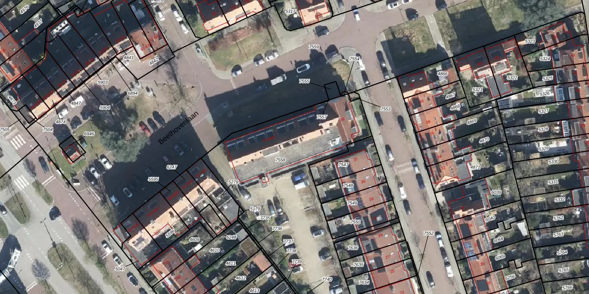 Het perceel waarop Beethovenlaan 84-3 staat heeft een oppervlakte van 2197 m². Dit is een zeer groot perceel. De perceeloppervlakte wordt geregistreerd door het Kadaster. Gedetailleerde informatie over de maten van dit perceel kunt u vinden in het rapport Kadastrale kaart met maatvoering van Beethovenlaan 84-3.