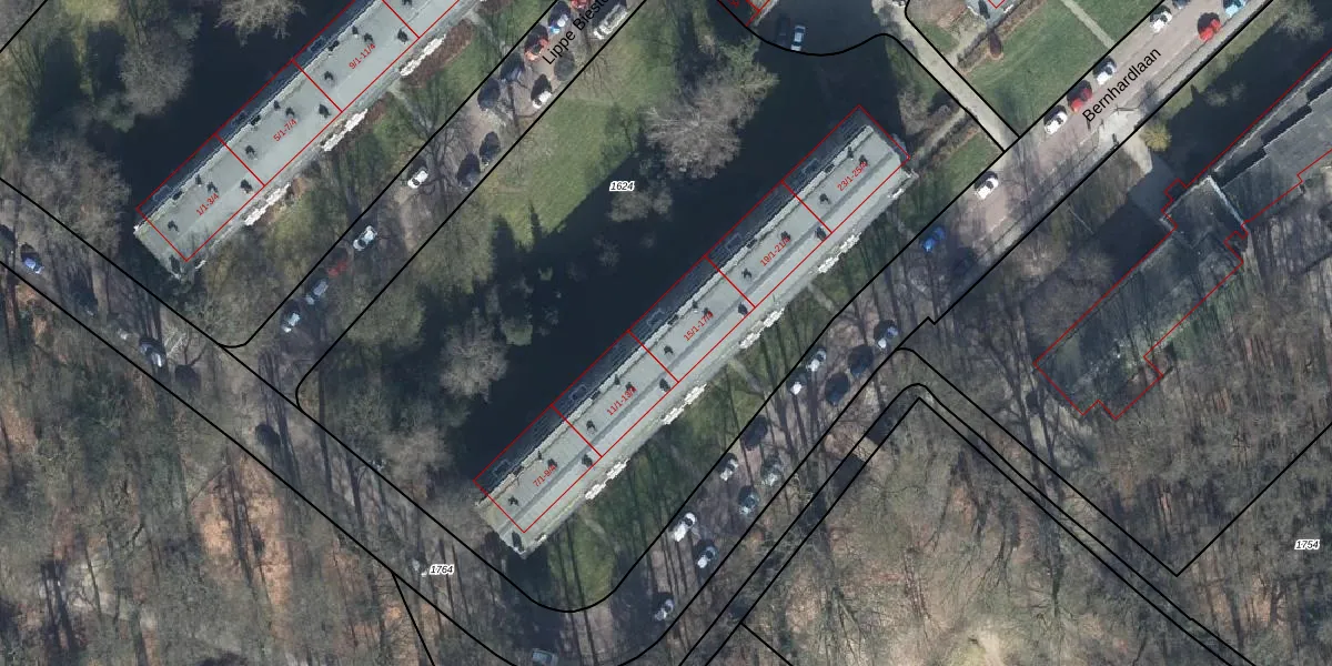 Het perceel waarop Bernhardlaan 15-4 staat heeft een oppervlakte van 5070 m². Dit is een zeer groot perceel. De perceeloppervlakte wordt geregistreerd door het Kadaster. Gedetailleerde informatie over de maten van dit perceel kunt u vinden in het rapport Kadastrale kaart met maatvoering van Bernhardlaan 15-4.