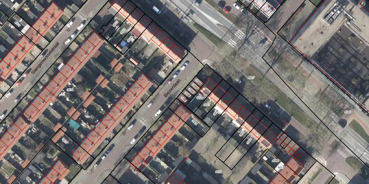 Het perceel waarop Biezenlaan 1-D staat heeft een oppervlakte van 20 m². Dit is een klein perceel. De perceeloppervlakte wordt geregistreerd door het Kadaster. Gedetailleerde informatie over de maten van dit perceel kunt u vinden in het rapport Kadastrale kaart met maatvoering van Biezenlaan 1-D.