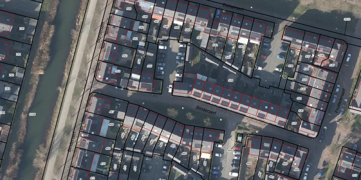 Het perceel waarop Binderserf 5 staat heeft een oppervlakte van 1469 m². Dit is een zeer groot perceel. De perceeloppervlakte wordt geregistreerd door het Kadaster. Gedetailleerde informatie over de maten van dit perceel kunt u vinden in het rapport Kadastrale kaart met maatvoering van Binderserf 5.
