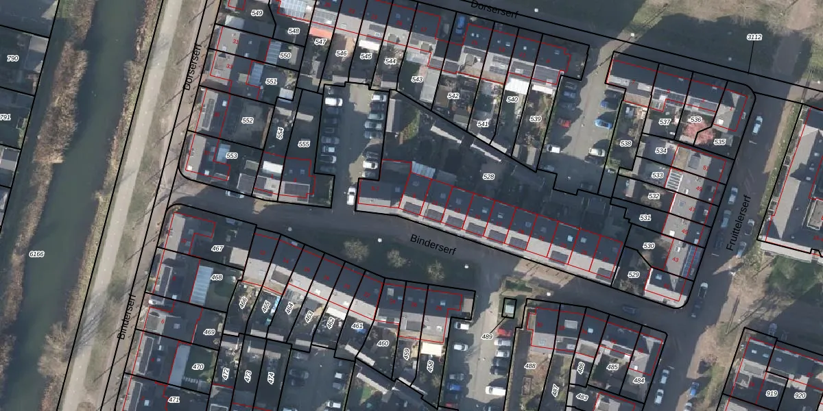 Het perceel waarop Binderserf 9 staat heeft een oppervlakte van 1469 m². Dit is een zeer groot perceel. De perceeloppervlakte wordt geregistreerd door het Kadaster. Gedetailleerde informatie over de maten van dit perceel kunt u vinden in het rapport Kadastrale kaart met maatvoering van Binderserf 9.