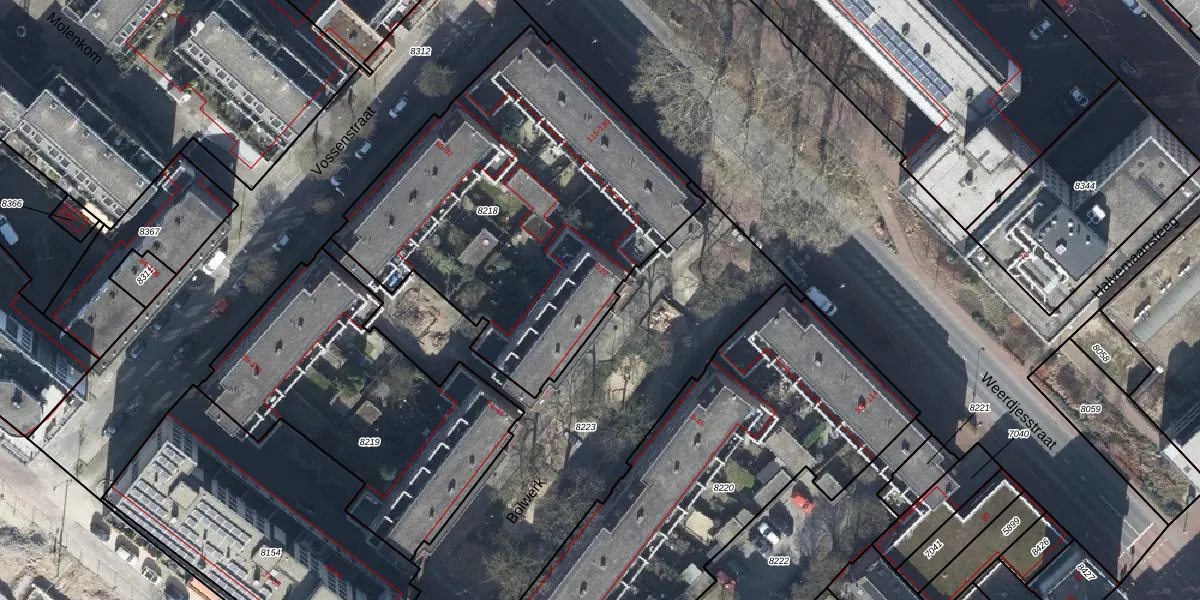 Het perceel waarop Bolwerk 8 staat heeft een oppervlakte van 1935 m². Dit is een zeer groot perceel. De perceeloppervlakte wordt geregistreerd door het Kadaster. Gedetailleerde informatie over de maten van dit perceel kunt u vinden in het rapport Kadastrale kaart met maatvoering van Bolwerk 8.