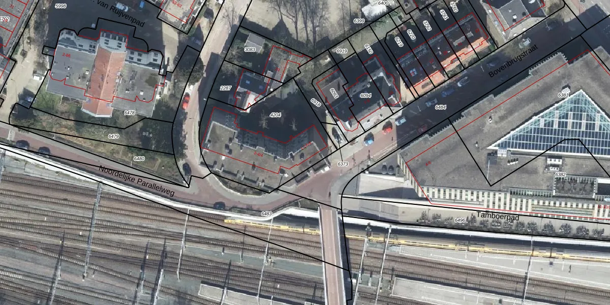 Het perceel waarop Bovenbrugstraat 1-2 staat heeft een oppervlakte van 1063 m². Dit is een zeer groot perceel. De perceeloppervlakte wordt geregistreerd door het Kadaster. Gedetailleerde informatie over de maten van dit perceel kunt u vinden in het rapport Kadastrale kaart met maatvoering van Bovenbrugstraat 1-2.