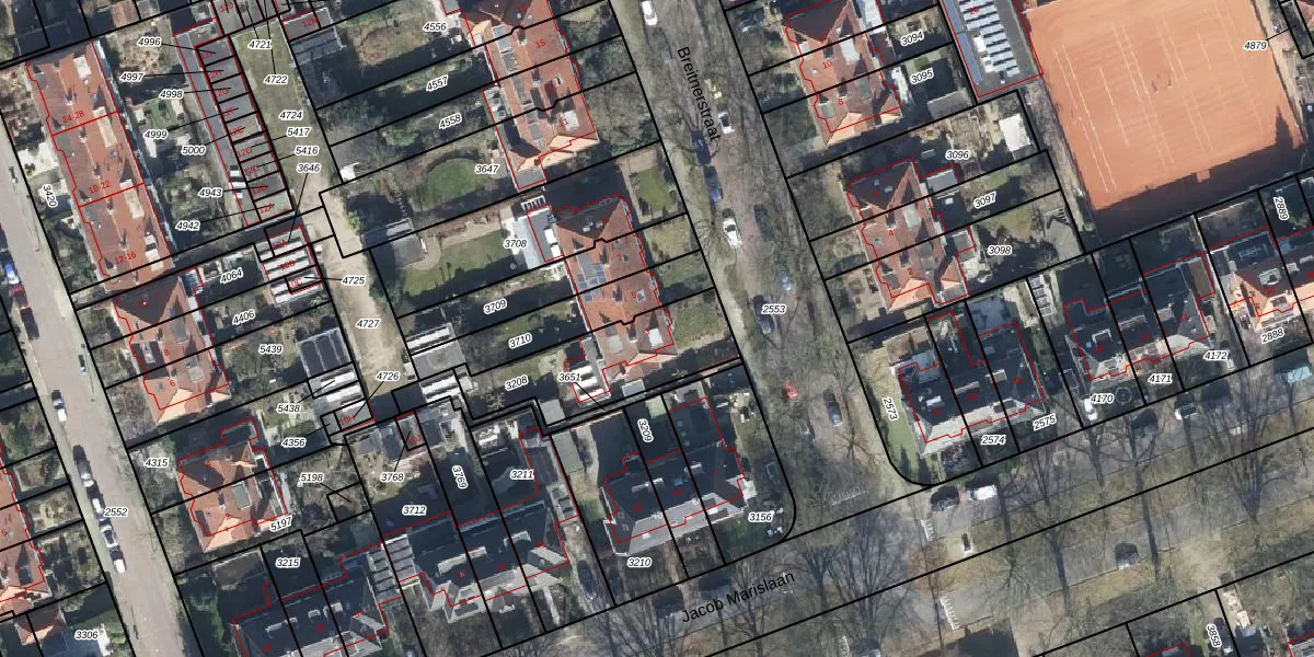 Het perceel waarop Breitnerstraat 3 staat heeft een oppervlakte van 426 m². Dit is een groot perceel. De perceeloppervlakte wordt geregistreerd door het Kadaster. Gedetailleerde informatie over de maten van dit perceel kunt u vinden in het rapport Kadastrale kaart met maatvoering van Breitnerstraat 3.