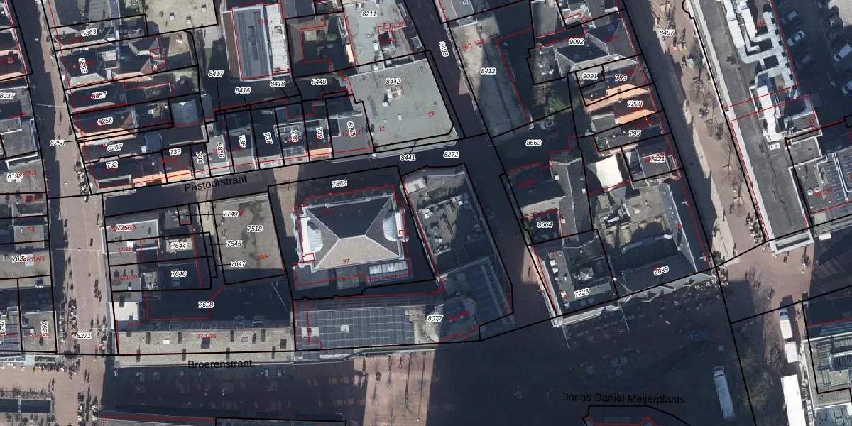 Het perceel waarop Broerenstraat 39-27 staat heeft een oppervlakte van 1085 m². Dit is een zeer groot perceel. De perceeloppervlakte wordt geregistreerd door het Kadaster. Gedetailleerde informatie over de maten van dit perceel kunt u vinden in het rapport Kadastrale kaart met maatvoering van Broerenstraat 39-27.