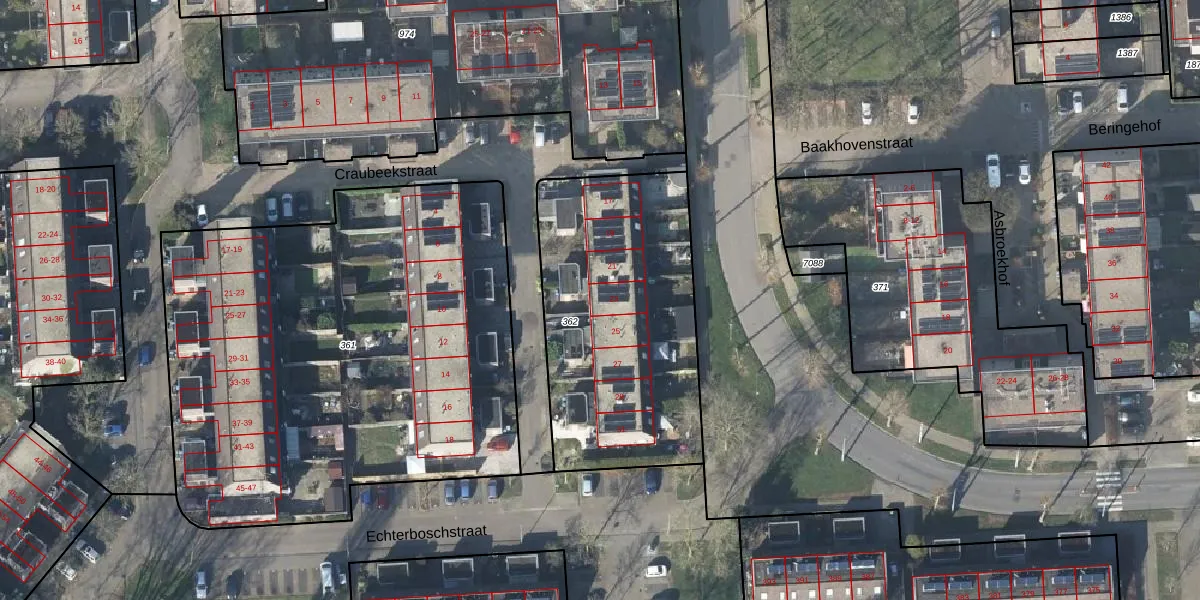 Het perceel waarop Craubeekstraat 23 staat heeft een oppervlakte van 1214 m². Dit is een zeer groot perceel. De perceeloppervlakte wordt geregistreerd door het Kadaster. Gedetailleerde informatie over de maten van dit perceel kunt u vinden in het rapport Kadastrale kaart met maatvoering van Craubeekstraat 23.
