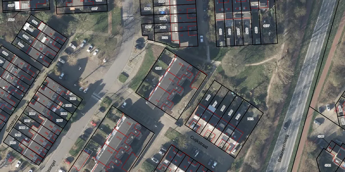 Het perceel waarop Cuijkstraat 21 staat heeft een oppervlakte van 911 m². Dit is een groot perceel. De perceeloppervlakte wordt geregistreerd door het Kadaster. Gedetailleerde informatie over de maten van dit perceel kunt u vinden in het rapport Kadastrale kaart met maatvoering van Cuijkstraat 21.