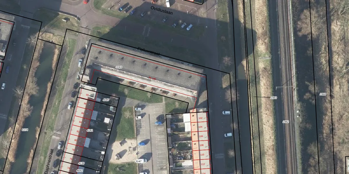 Het perceel waarop Daphnestraat 106 staat heeft een oppervlakte van 1377 m². Dit is een zeer groot perceel. De perceeloppervlakte wordt geregistreerd door het Kadaster. Gedetailleerde informatie over de maten van dit perceel kunt u vinden in het rapport Kadastrale kaart met maatvoering van Daphnestraat 106.