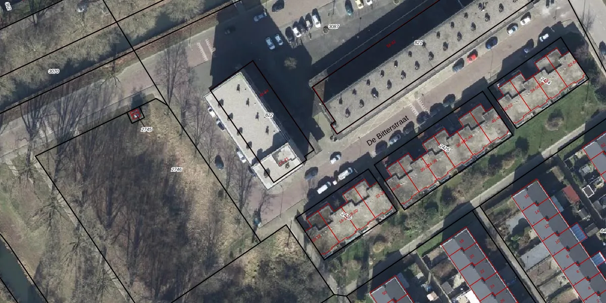 Het perceel waarop De Bitterstraat 1-2 staat heeft een oppervlakte van 624 m². Dit is een groot perceel. De perceeloppervlakte wordt geregistreerd door het Kadaster. Gedetailleerde informatie over de maten van dit perceel kunt u vinden in het rapport Kadastrale kaart met maatvoering van De Bitterstraat 1-2.
