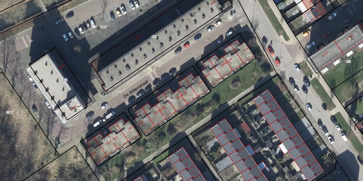 Het perceel waarop De Bitterstraat 42 staat heeft een oppervlakte van 777 m². Dit is een groot perceel. De perceeloppervlakte wordt geregistreerd door het Kadaster. Gedetailleerde informatie over de maten van dit perceel kunt u vinden in het rapport Kadastrale kaart met maatvoering van De Bitterstraat 42.