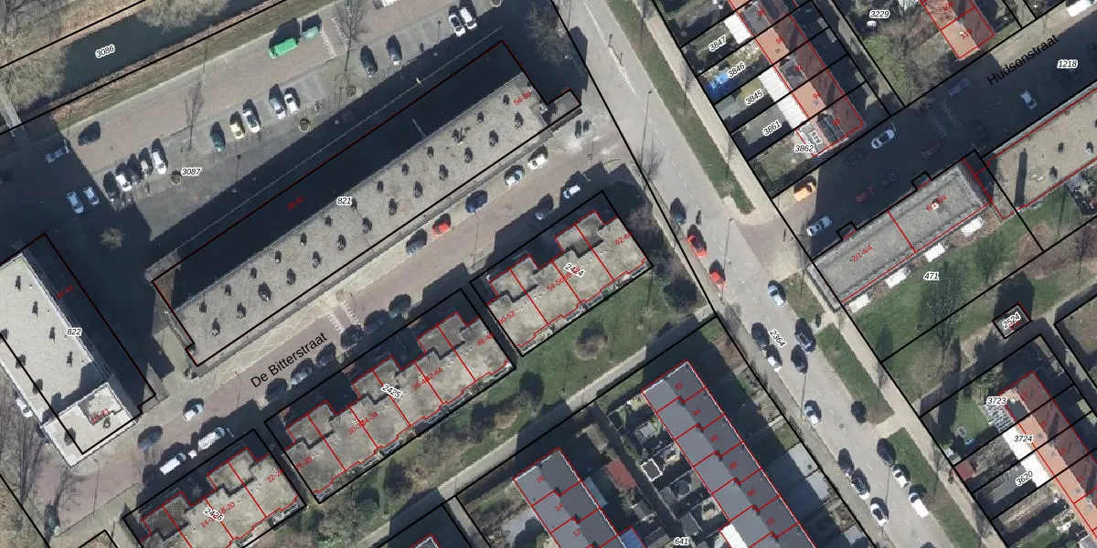 Het perceel waarop De Bitterstraat 54 staat heeft een oppervlakte van 487 m². Dit is een groot perceel. De perceeloppervlakte wordt geregistreerd door het Kadaster. Gedetailleerde informatie over de maten van dit perceel kunt u vinden in het rapport Kadastrale kaart met maatvoering van De Bitterstraat 54.