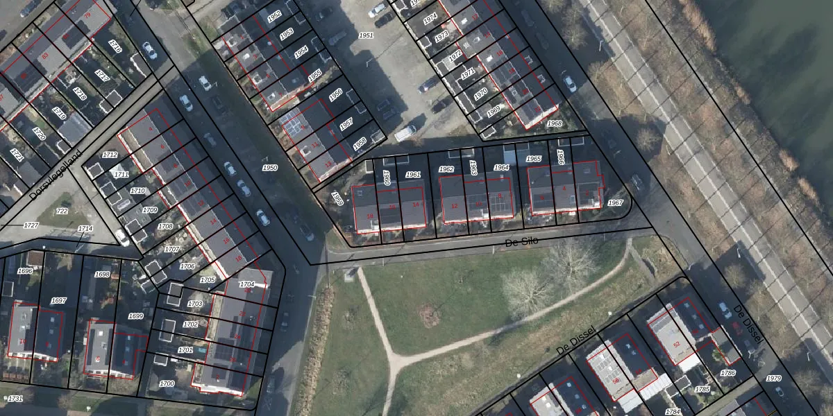 Het perceel waarop De Silo 14 staat heeft een oppervlakte van 163 m². Dit is een middelgroot perceel. De perceeloppervlakte wordt geregistreerd door het Kadaster. Gedetailleerde informatie over de maten van dit perceel kunt u vinden in het rapport Kadastrale kaart met maatvoering van De Silo 14.