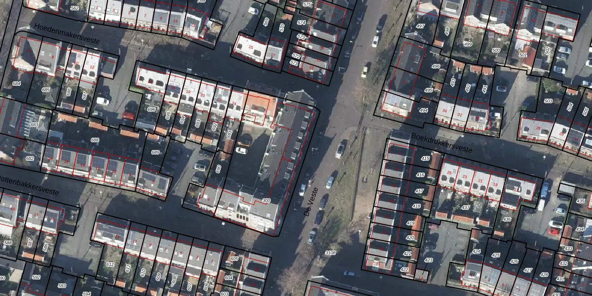 Het perceel waarop De Veste 16 staat heeft een oppervlakte van 1090 m². Dit is een zeer groot perceel. De perceeloppervlakte wordt geregistreerd door het Kadaster. Gedetailleerde informatie over de maten van dit perceel kunt u vinden in het rapport Kadastrale kaart met maatvoering van De Veste 16.