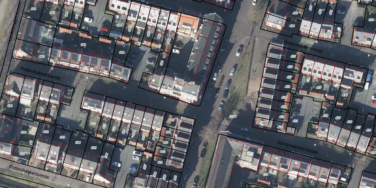Het perceel waarop De Veste 34 staat heeft een oppervlakte van 1090 m². Dit is een zeer groot perceel. De perceeloppervlakte wordt geregistreerd door het Kadaster. Gedetailleerde informatie over de maten van dit perceel kunt u vinden in het rapport Kadastrale kaart met maatvoering van De Veste 34.