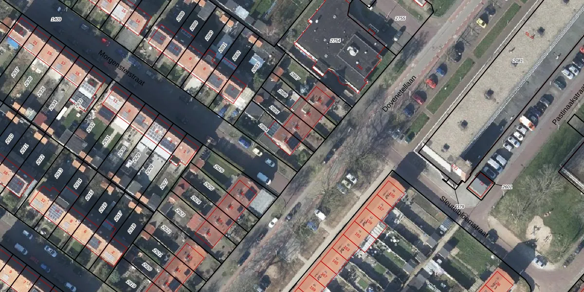 Gebruik de zoekbalk of klik op een perceel voor informatie over de adressen binnen dit perceel.