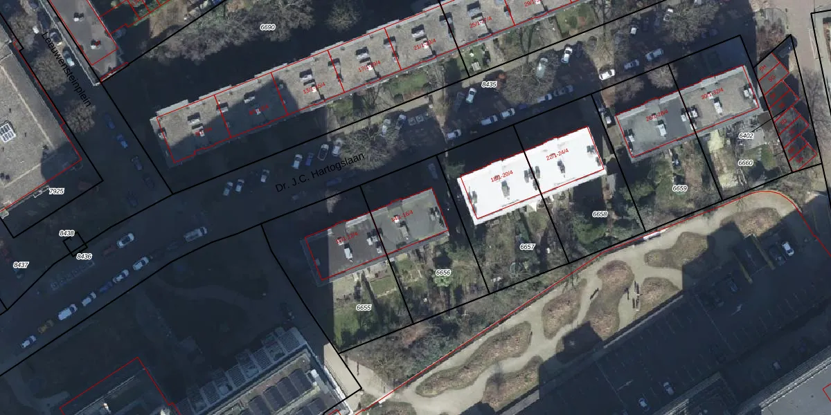 Dr. J.C. Hartogslaan 16-2 is gelegen op kadastraal perceel AHM01R6656. Deze kadastrale aanduiding is uniek en wordt gebruikt door het Kadaster om eigendomsrechten en andere zakelijke rechten vast te leggen. Het perceel maakt onderdeel uit van de kadastrale gemeente Arnhem.