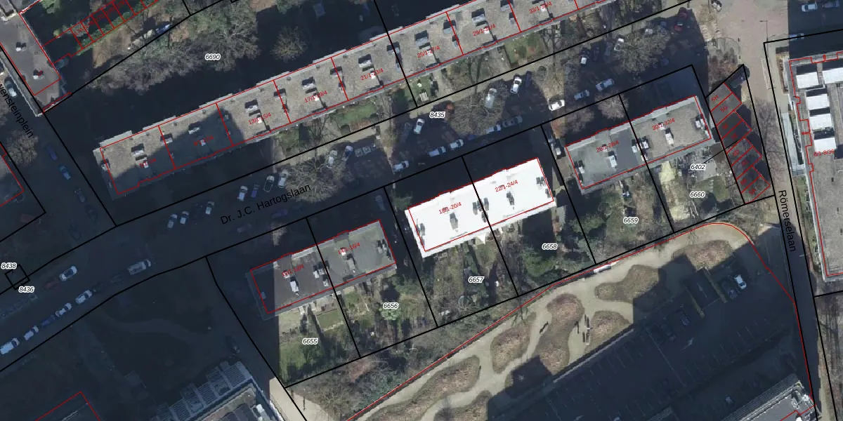 Dr. J.C. Hartogslaan 18-1 is gelegen op kadastraal perceel AHM01R6657. Deze kadastrale aanduiding is uniek en wordt gebruikt door het Kadaster om eigendomsrechten en andere zakelijke rechten vast te leggen. Het perceel maakt onderdeel uit van de kadastrale gemeente Arnhem.