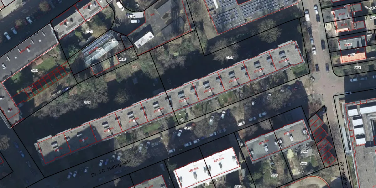 Dr. J.C. Hartogslaan 27-4 is gelegen op kadastraal perceel AHM01R6355. Deze kadastrale aanduiding is uniek en wordt gebruikt door het Kadaster om eigendomsrechten en andere zakelijke rechten vast te leggen. Het perceel maakt onderdeel uit van de kadastrale gemeente Arnhem.