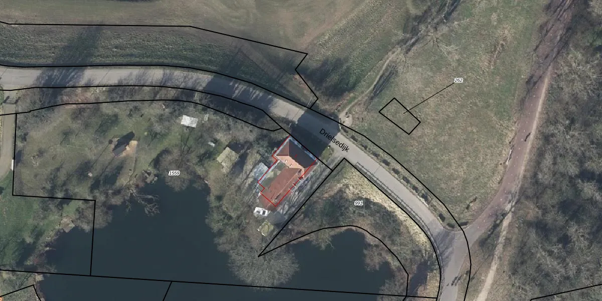 Het perceel waarop Drielsedijk 1 staat heeft een oppervlakte van 5370 m². Dit is een zeer groot perceel. De perceeloppervlakte wordt geregistreerd door het Kadaster. Gedetailleerde informatie over de maten van dit perceel kunt u vinden in het rapport Kadastrale kaart met maatvoering van Drielsedijk 1.