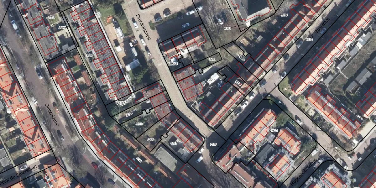Het perceel waarop Druckerstraat 2 staat heeft een oppervlakte van 1108 m². Dit is een zeer groot perceel. De perceeloppervlakte wordt geregistreerd door het Kadaster. Gedetailleerde informatie over de maten van dit perceel kunt u vinden in het rapport Kadastrale kaart met maatvoering van Druckerstraat 2.