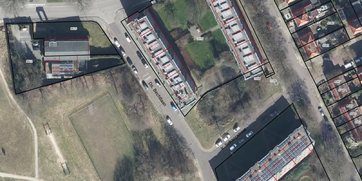 Het perceel waarop Ds. Bechtlaan 2-2 staat heeft een oppervlakte van 3465 m². Dit is een zeer groot perceel. De perceeloppervlakte wordt geregistreerd door het Kadaster. Gedetailleerde informatie over de maten van dit perceel kunt u vinden in het rapport Kadastrale kaart met maatvoering van Ds. Bechtlaan 2-2.