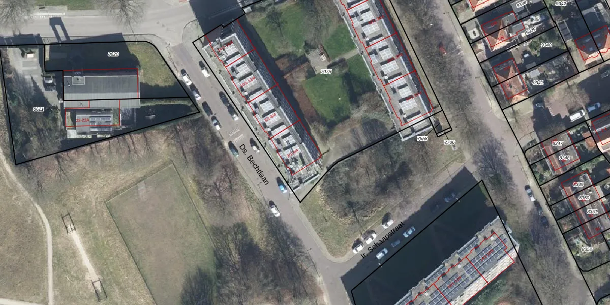 Het perceel waarop Ds. Bechtlaan 2-4 staat heeft een oppervlakte van 3465 m². Dit is een zeer groot perceel. De perceeloppervlakte wordt geregistreerd door het Kadaster. Gedetailleerde informatie over de maten van dit perceel kunt u vinden in het rapport Kadastrale kaart met maatvoering van Ds. Bechtlaan 2-4.