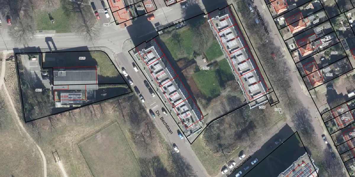 Het perceel waarop Ds. Bechtlaan 8-4 staat heeft een oppervlakte van 3465 m². Dit is een zeer groot perceel. De perceeloppervlakte wordt geregistreerd door het Kadaster. Gedetailleerde informatie over de maten van dit perceel kunt u vinden in het rapport Kadastrale kaart met maatvoering van Ds. Bechtlaan 8-4.