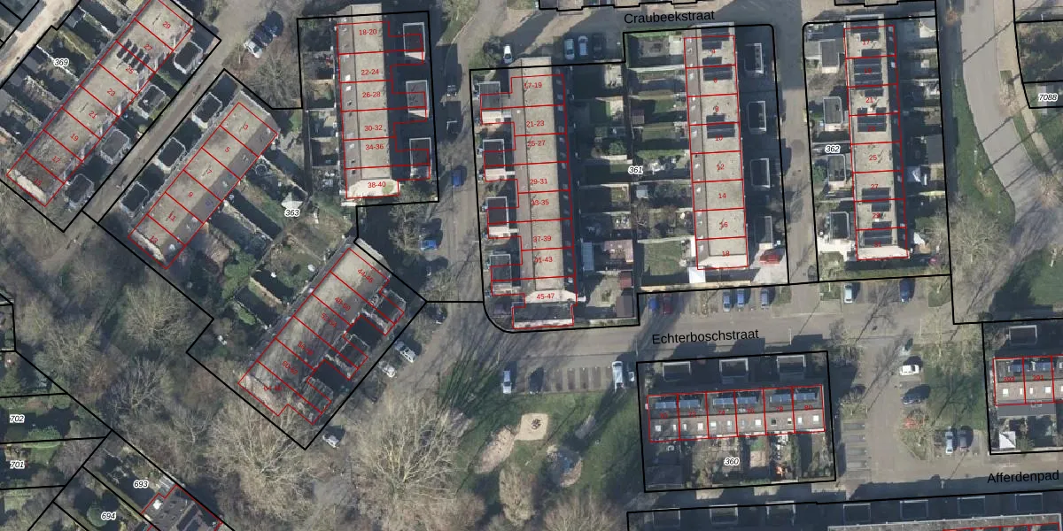 Echterboschstraat 41 is gelegen op kadastraal perceel AHM04AE361. Deze kadastrale aanduiding is uniek en wordt gebruikt door het Kadaster om eigendomsrechten en andere zakelijke rechten vast te leggen. Het perceel maakt onderdeel uit van de kadastrale gemeente Arnhem.