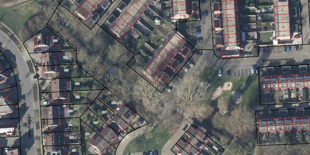 Het perceel waarop Echterboschstraat 66 staat heeft een oppervlakte van 2982 m². Dit is een zeer groot perceel. De perceeloppervlakte wordt geregistreerd door het Kadaster. Gedetailleerde informatie over de maten van dit perceel kunt u vinden in het rapport Kadastrale kaart met maatvoering van Echterboschstraat 66.