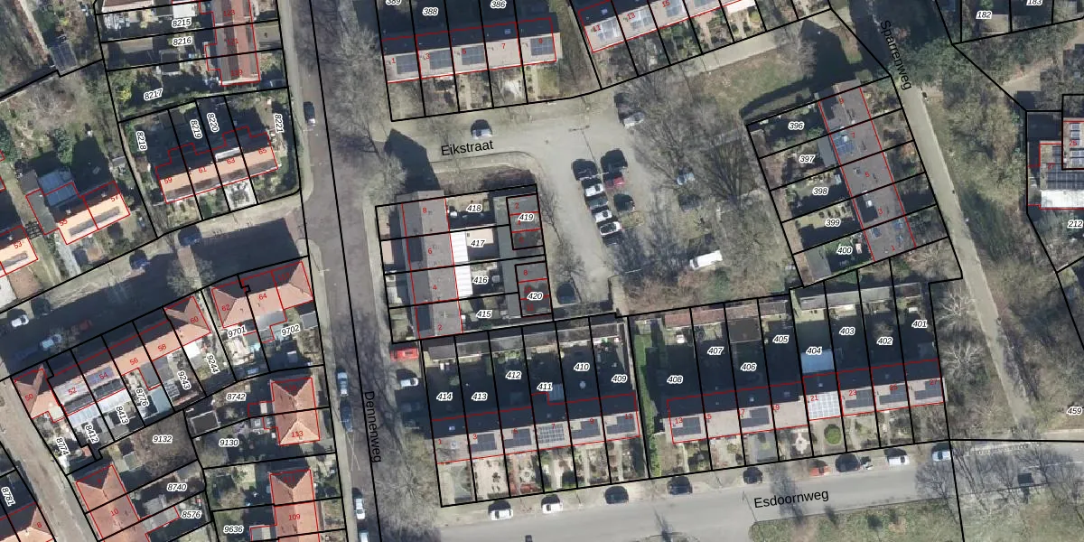 Het perceel waarop Eikstraat 8 staat heeft een oppervlakte van 55 m². Dit is een klein perceel. De perceeloppervlakte wordt geregistreerd door het Kadaster. Gedetailleerde informatie over de maten van dit perceel kunt u vinden in het rapport Kadastrale kaart met maatvoering van Eikstraat 8.