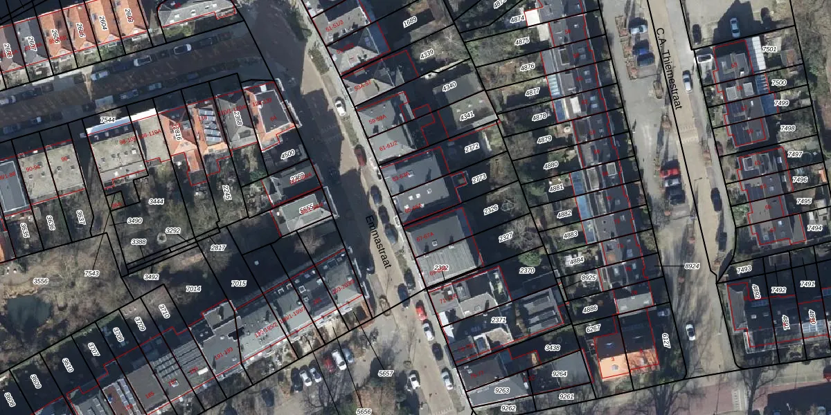 Het perceel waarop Emmastraat 65-A staat heeft een oppervlakte van 233 m². Dit is een middelgroot perceel. De perceeloppervlakte wordt geregistreerd door het Kadaster. Gedetailleerde informatie over de maten van dit perceel kunt u vinden in het rapport Kadastrale kaart met maatvoering van Emmastraat 65-A.