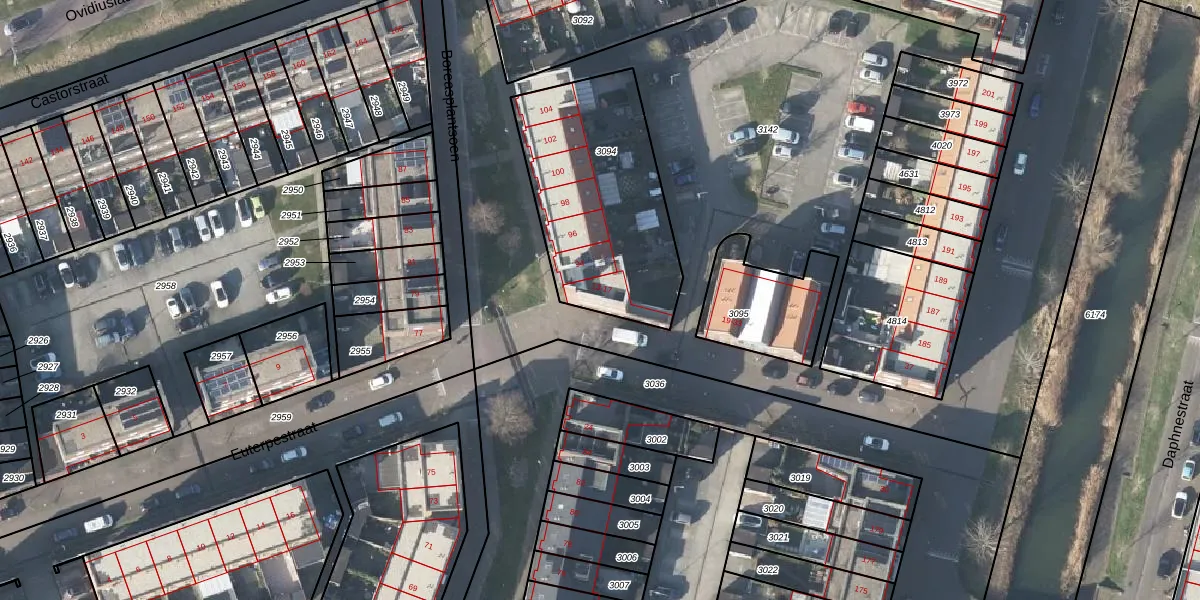 Euterpestraat 13 is gelegen op kadastraal perceel AHM05AF3094. Deze kadastrale aanduiding is uniek en wordt gebruikt door het Kadaster om eigendomsrechten en andere zakelijke rechten vast te leggen. Het perceel maakt onderdeel uit van de kadastrale gemeente Arnhem.