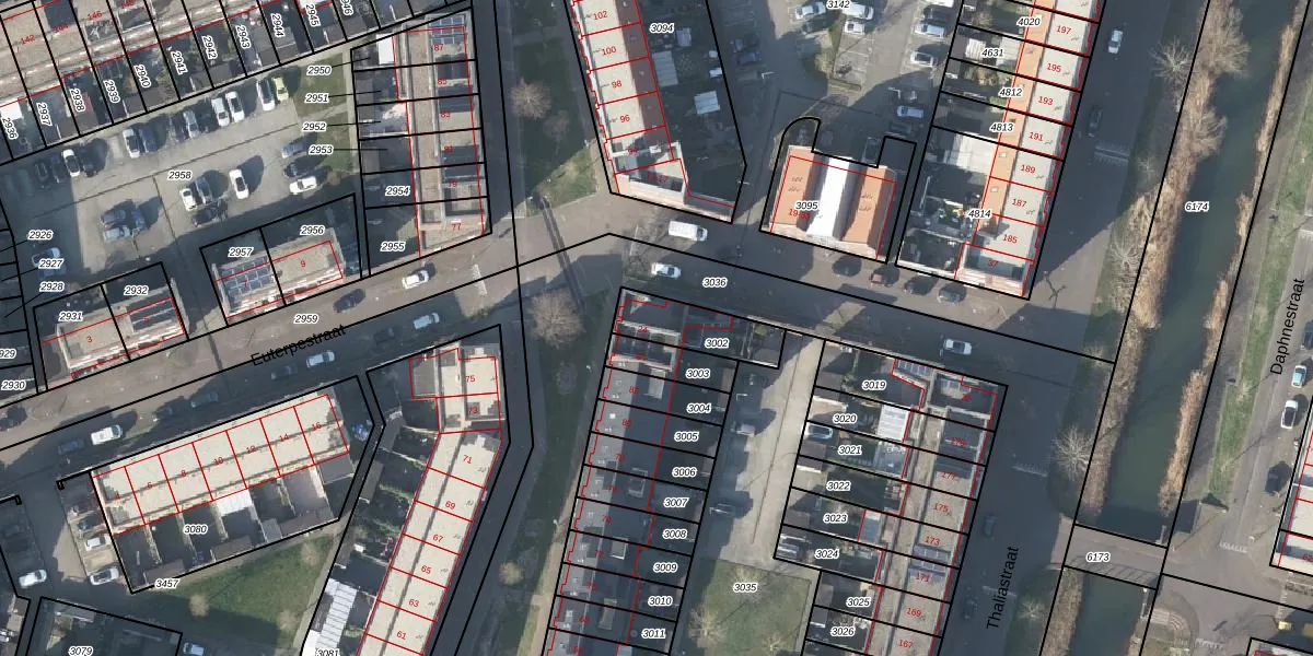 Het perceel waarop Euterpestraat 24 staat heeft een oppervlakte van 172 m². Dit is een middelgroot perceel. De perceeloppervlakte wordt geregistreerd door het Kadaster. Gedetailleerde informatie over de maten van dit perceel kunt u vinden in het rapport Kadastrale kaart met maatvoering van Euterpestraat 24.