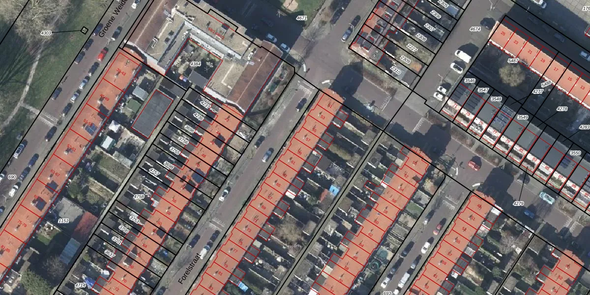 Het perceel waarop Forelstraat 59 staat heeft een oppervlakte van 4528 m². Dit is een zeer groot perceel. De perceeloppervlakte wordt geregistreerd door het Kadaster. Gedetailleerde informatie over de maten van dit perceel kunt u vinden in het rapport Kadastrale kaart met maatvoering van Forelstraat 59.