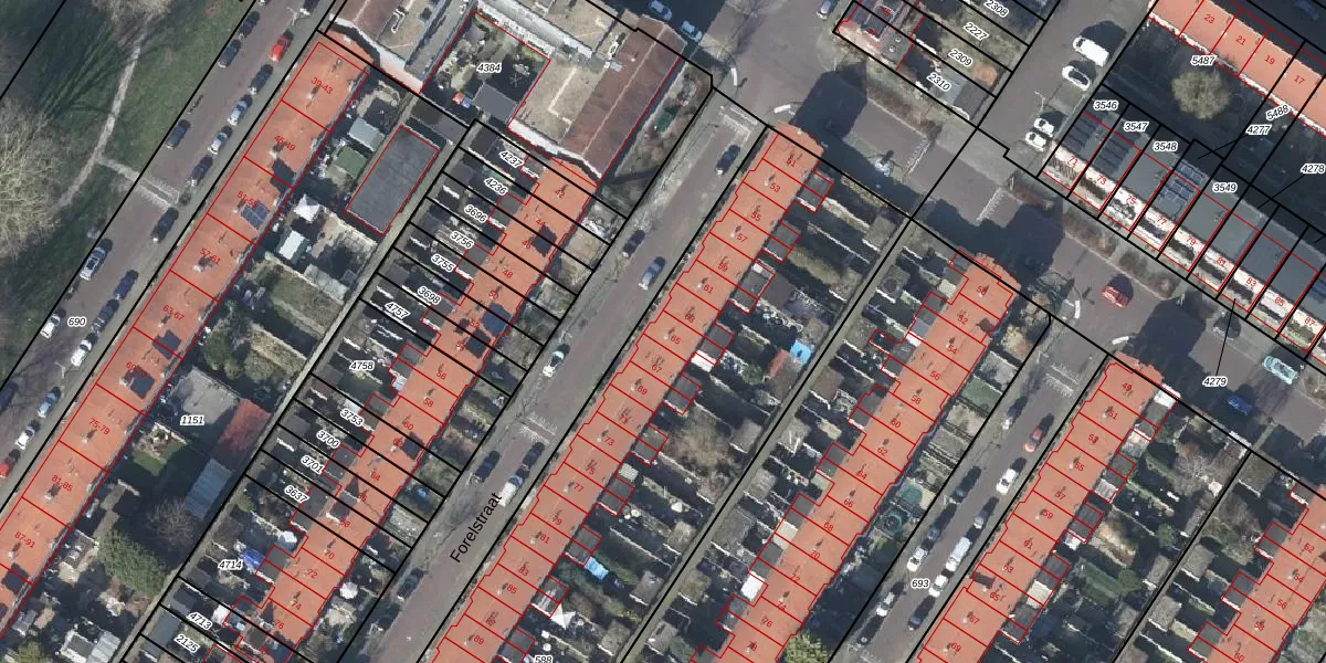 Het perceel waarop Forelstraat 65 staat heeft een oppervlakte van 4528 m². Dit is een zeer groot perceel. De perceeloppervlakte wordt geregistreerd door het Kadaster. Gedetailleerde informatie over de maten van dit perceel kunt u vinden in het rapport Kadastrale kaart met maatvoering van Forelstraat 65.