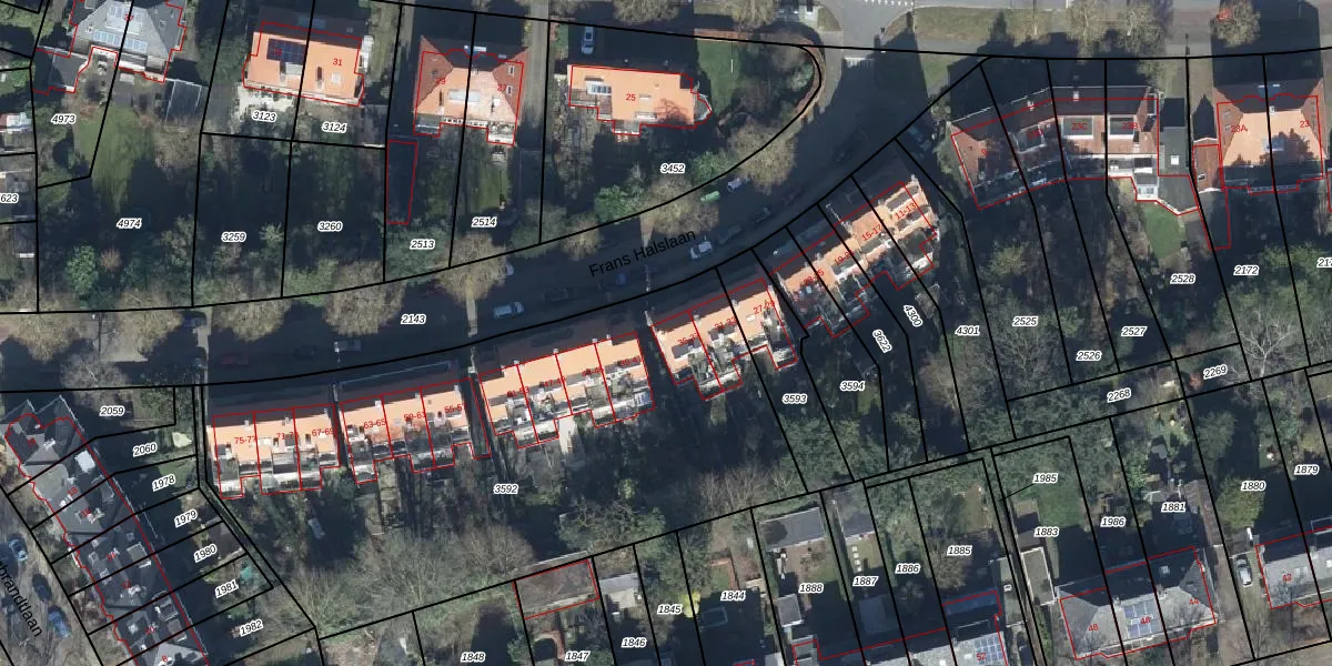 Het perceel waarop Frans Halslaan 37 staat heeft een oppervlakte van 2940 m². Dit is een zeer groot perceel. De perceeloppervlakte wordt geregistreerd door het Kadaster. Gedetailleerde informatie over de maten van dit perceel kunt u vinden in het rapport Kadastrale kaart met maatvoering van Frans Halslaan 37.