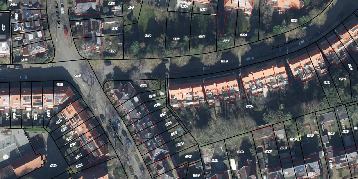 Het perceel waarop Frans Halslaan 75 staat heeft een oppervlakte van 2940 m². Dit is een zeer groot perceel. De perceeloppervlakte wordt geregistreerd door het Kadaster. Gedetailleerde informatie over de maten van dit perceel kunt u vinden in het rapport Kadastrale kaart met maatvoering van Frans Halslaan 75.